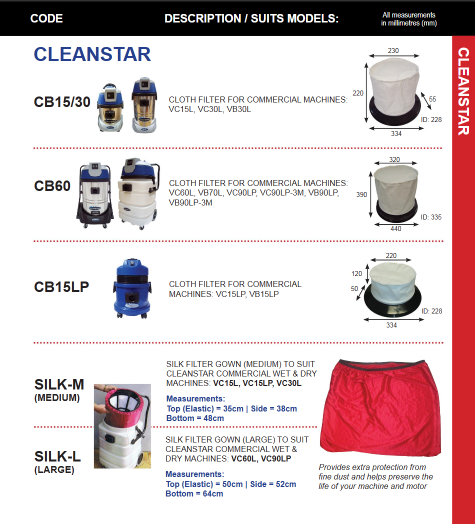 • Cleanstar Commercial Machines: VC15L, VC30L, VB30L.