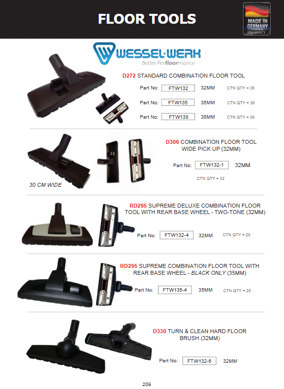 The Wessel‑Werk RD272 Standard Combination Floor Tool – 32mm is a versatile German‑made vacuum cleaner attachment that easily switches between carpet and hard floor modes. With a universal 32 mm fit, durable construction and smooth manoeuvrability, it enhances cleaning performance across all floor types.