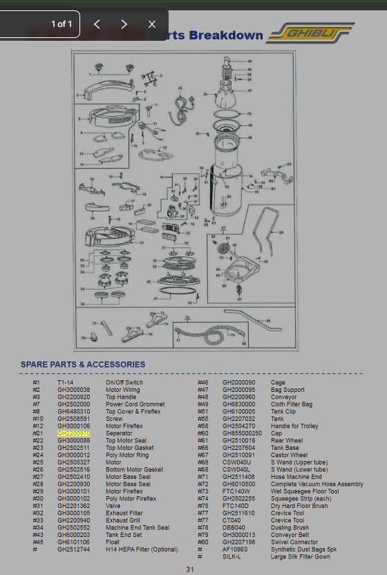 The Ghibli Seperator - AS12P is a genuine OEM replacement separator designed to suit the Ghibli AS12P‑series wet & dry commercial vacuum cleaner (including AS12P‑CBN models). This precision‑engineered separator plays a vital role in the vacuum’s internal airflow and debris‑management system, helping to separate larger particles and moisture from fine dust before it reaches the main filter. By improving the machine’s ability to handle mixed wet/dry waste and reducing premature filter clogging, this component enhances suction efficiency and extends the life of filters and the vacuum’s motor. Built to original manufacturer specifications, the Ghibli separator is durable, easy to install, and an ideal maintenance or replacement part for professional cleaning crews, facility managers, and service technicians. Whether you’re servicing a high‑use commercial vacuum or replacing a worn part, this separator helps maintain optimal performance, minimise downtime, and deliver reliable cleaning results in demanding environments such as warehouses, workshops, hospitality venues, and industrial facilities.