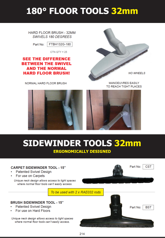 Professional Brush Sidewinder Tool for hard floors with swivel design. Compatible with RAE032 rods. Durable floor cleaning attachment from Cleanstar.