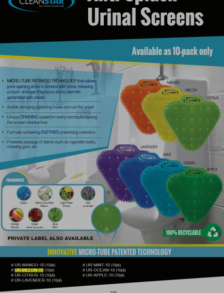 Keep your restrooms fresh and clean with the Cleanstar Anti-Splash Urinal Screen in a refreshing Cucumber Melon scent. Designed to eliminate unwanted splashes and reduce odors, this 10-pack of anti-splash screens is ideal for high-traffic commercial restrooms. The specially engineered design helps prevent urine backsplash while releasing a long-lasting fragrance to maintain a pleasant bathroom environment.