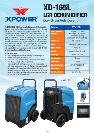 The XPOWER XD-165L Low Grain Refrigerant (LGR) Dehumidifier achieves maximum humidity control and water removal efficiency. This all new ‘XXL’ category unit is capable of removing up to 165 Pints/78 Litres per day @ AHAM (26.7°C, 60% RH) and 280 Pint/132 Litres per day at full saturation (32.2°C, 90% RH). The unit has an electronic display that assists in monitoring the temperature and humidity at the exhaust, as well as recording the total operating life of the dehumidifier. Lay flat ducting can be applied to the exhaust point of the dehumidifier with the dual ducting ring that is included on the unit to transport warm/dry air to where it is needed. Weighing 55kg with rugged wheels and telescoping handle, the ultra-mobile XD-165L gives you class leading LGR performance.